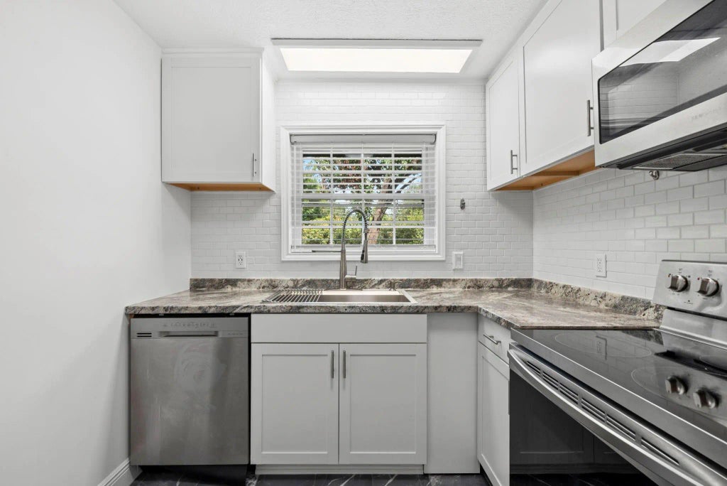 Beautifully updated 2-bedroom downstairs condo in a non-flood zone—the nicest unit in the community! This move-in-ready home features porcelain tile throughout, fresh paint, white shaker cabinets, granite countertops, and brand new Samsung appliances (oven, dishwasher, microwave). Bathroom is fully remodeled with a modern vanity, walk-in shower with sliding glass door, mirror, new fixtures, and in-unit washer & dryer. Motion-sensor lights in closets and hallway, plus all new windows and doors. Comes with 3 remotes for custom light settings. Located in a well-maintained complex with a private pool, just minutes from the Galleria, shopping, and top dining spots. HOA covers water, electricity, and exterior maintenance—a rare find! Easy access to Hwy 59, 610, and the Inner Loop. This one won't last—schedule your showing today!