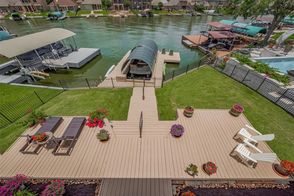 Welcome to Lake Conroe! South Shore Estates is a Gated Community just minutes from Shopping, Dining, and Golfing! This 5-bedroom Waterfront Home is Located in a Quiet Cove offering Amazing Views. Outdoor Living with an large Deck, Fenced Yard and Boat Lift. Primary Bedroom is Located on Main Floor. Upstairs You'll find a Second Primary Suite, Three Additional Bedrooms, Covered Balcony with Amazing Views, and a Spacious Game Room. Enjoy Access to Walden Country Club Membership. Recently Updated Roof and 3472 Square Feet of Living Space on a 6761 Square Foot Waterfront Lot. Gated community, low traffic on a calm quiet cove near a marina great for kayaking, paddleboarding, swimming, dock fishing. Short boat ride to Margaritaville and Waterpoint Shopping Center featuring great dining options. Large deck for sunning and entertaining, covered back porch up and downstairs Can support two home offices and still have four bedrooms for large families or guests. See Attached list of Updates.